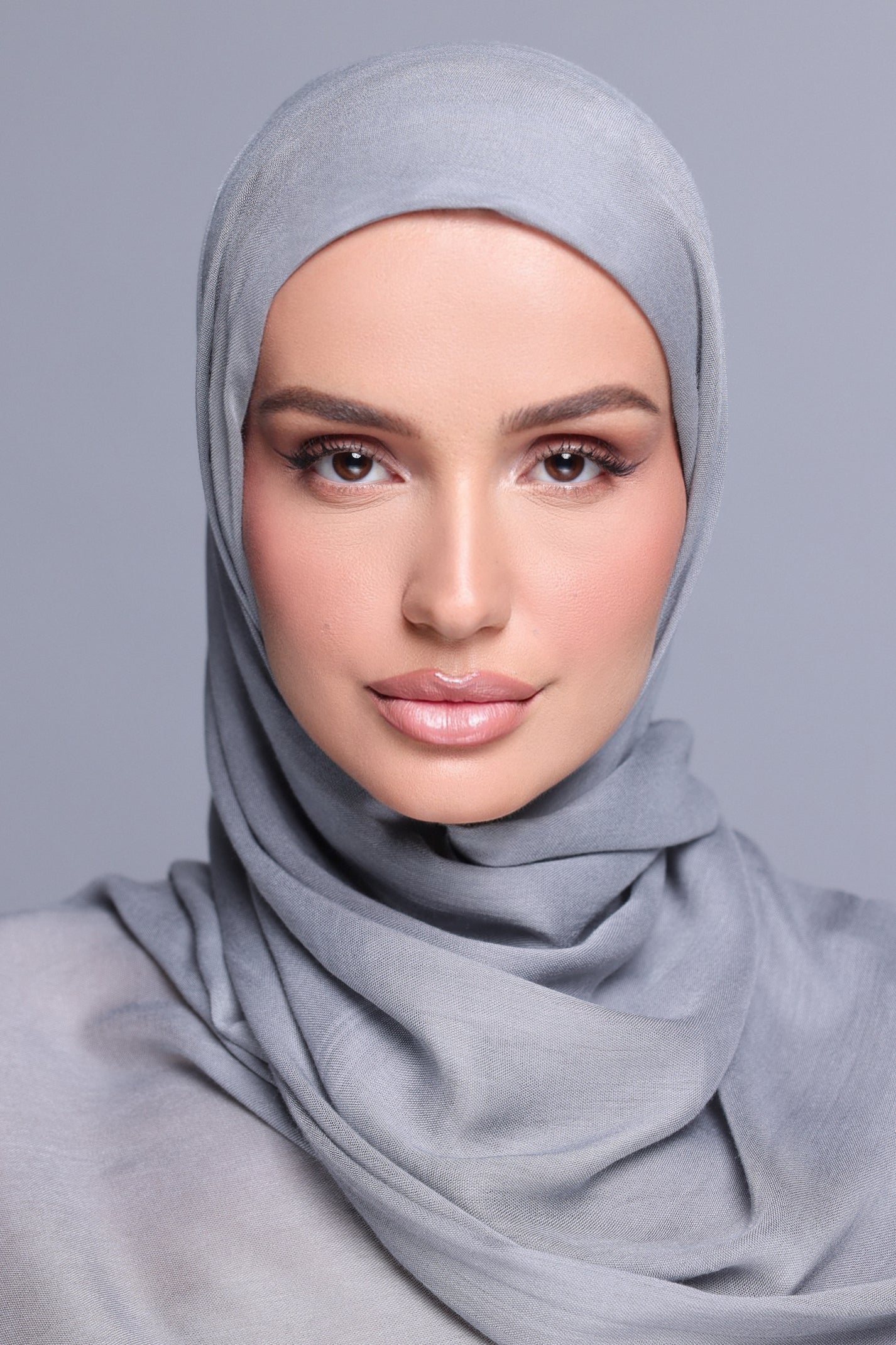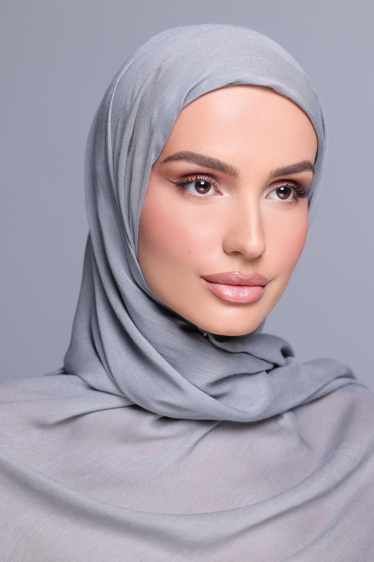 Experience the ultimate blend of luxury and functionality with our Silver Modal Hijab Set. This set includes a premium black modal hijab and a non-slip jersey undercap.